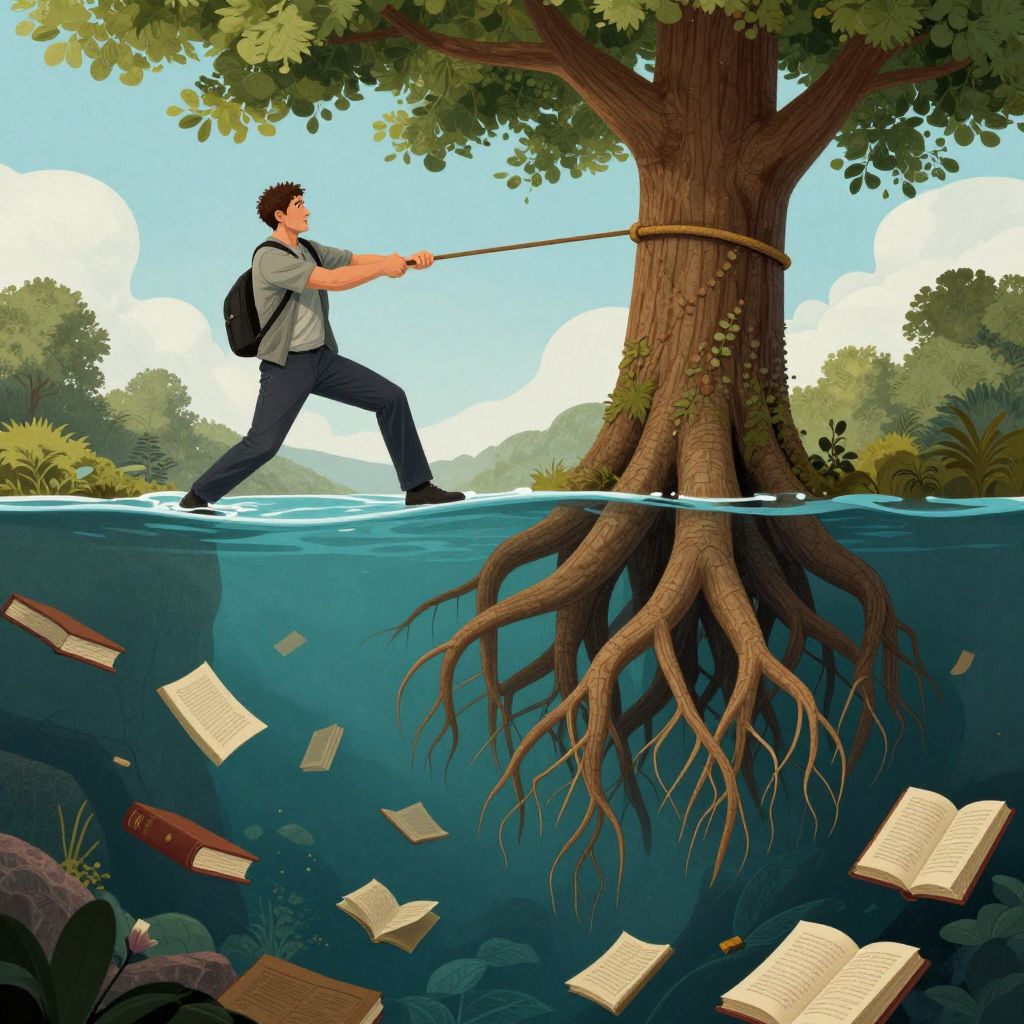 Illustration: Man with backpack, gray shirt, and black pants pulls rope tied to tree, underwater roots, floating books, vibrant forest background.