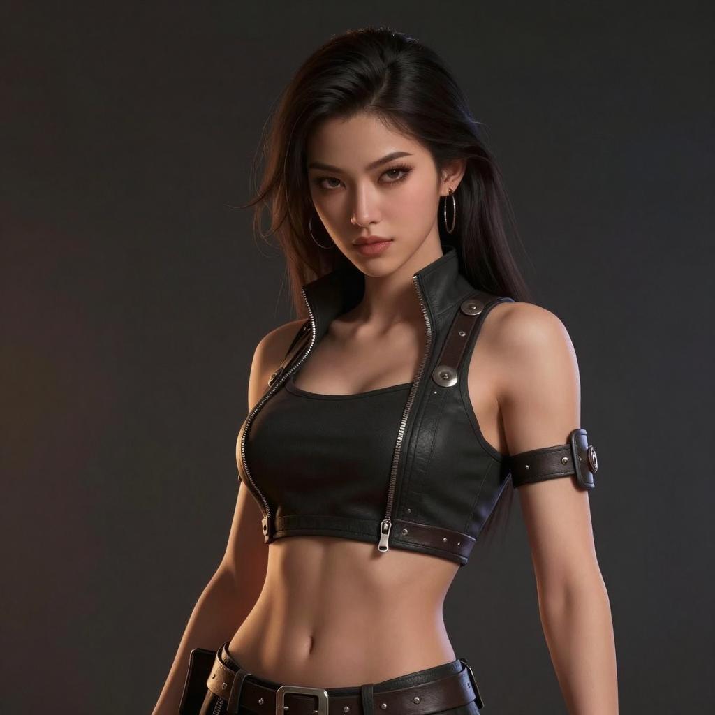 Digital illustration of a confident young East Asian woman wearing a black leather crop top with metal studs and a matching arm strap and belt. She has long dark hair, hoop earrings, and a serious expression, standing against a dark moody background with dramatic lighting highlighting her features.
