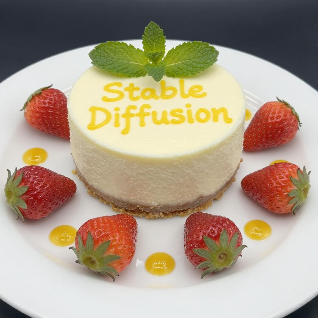Gourmet cheesecake with a smooth white surface and brown crust base, decorated with 'Stable Diffusion' written in yellow icing on top. Garnished with fresh mint leaves, surrounded by fresh strawberries and yellow sauce dots on a white plate. Studio-lit, showcasing detailed texture and an appealing presentation.