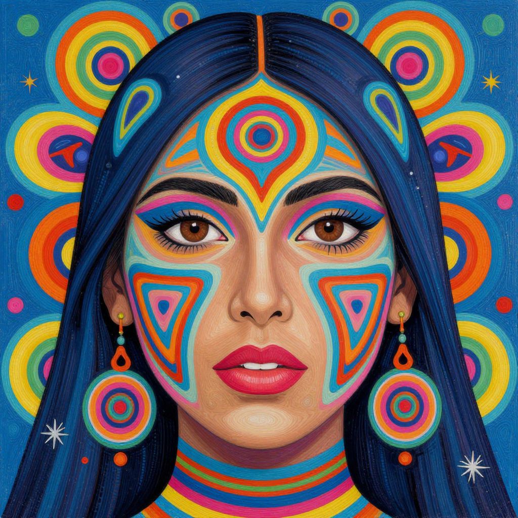 Digital painting of a woman with long black hair, colorful face paint, and vibrant geometric patterns, set against a blue background with circular designs.