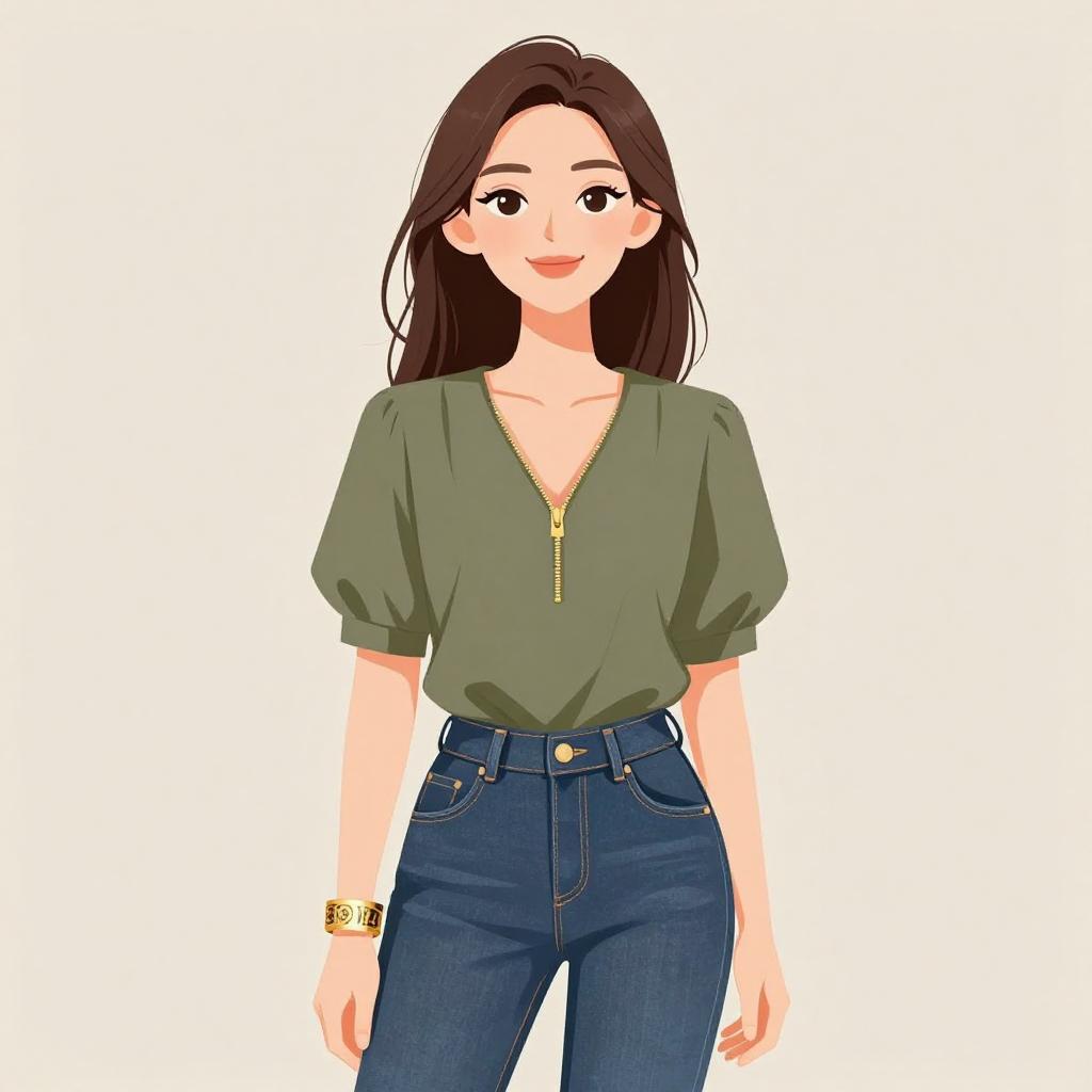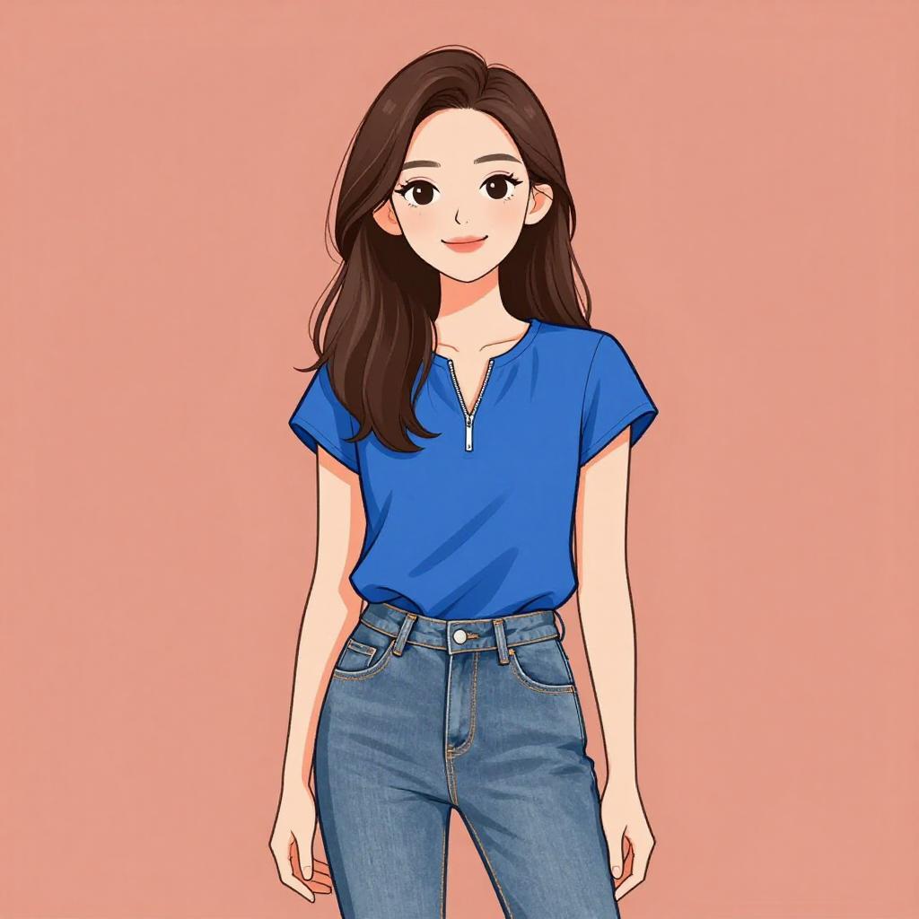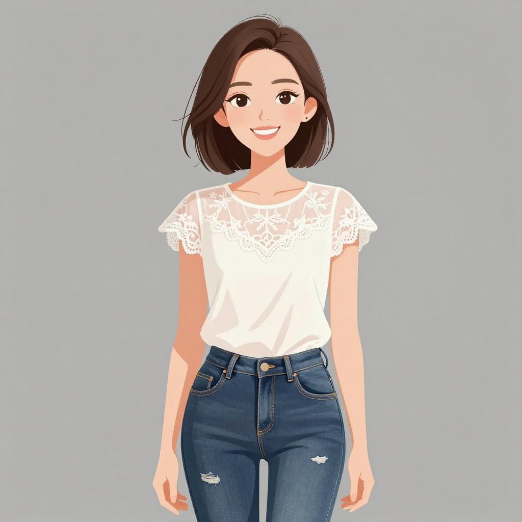 Woman with pretty face and pretty hair. smiling Woman, business casual, royal blue blouse, round neckline, long sleeves with lace detailing at the cuffs, dark-wash skinny jeans with slight distressing. --sref 1467