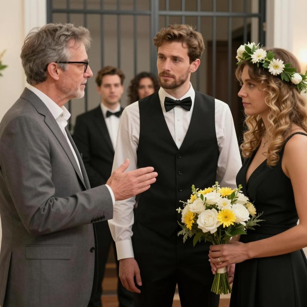 Photograph of a wedding in a Gothic-style church. Bride in white lace dress and veil, groom in black tuxedo, holding hands. Bridesmaid in pink dress, holding bouquet. Priest in white robe, facing them. Ornate chandelier, stained glass window in background. Groom and priest with serious expressions, bride with neutral expression. Candlelit altar in foreground.
