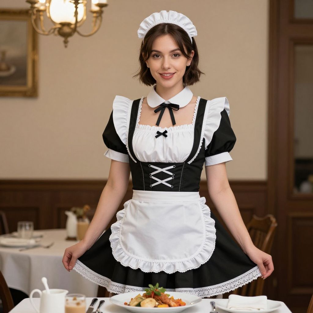 German maid outfit, woman in black and white dress standing in front of a table with a plate of food