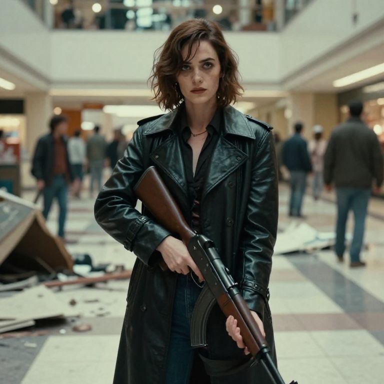 Photograph of a determined woman with wavy brown hair and fair skin, standing in a chaotic, brightly lit shopping mall. She wears a black leather trench coat over a black shirt, holding a dark brown rifle with both hands. Debris and shattered objects litter the floor. Blurred background includes people walking, some in dark clothing, and multiple store entrances. The image has a dramatic, action-packed feel, with the woman's intense expression and the mall's disorder creating a tense atmosphere. The lighting is bright but slightly overcast, enhancing the scene's urgency.