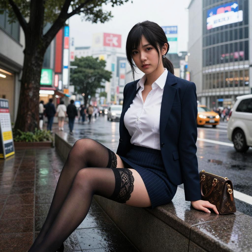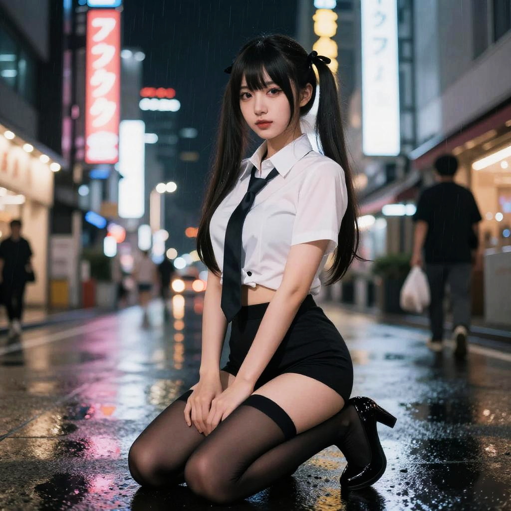Photograph of an Asian woman in a white blouse, black tie, and mini-skirt, kneeling on a rainy city street at night, with neon