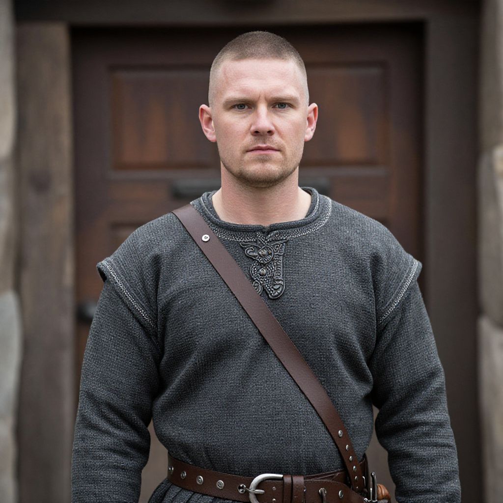 "Traditional Viking Garb, a close up of a man in a viking costume standing in front of a door"