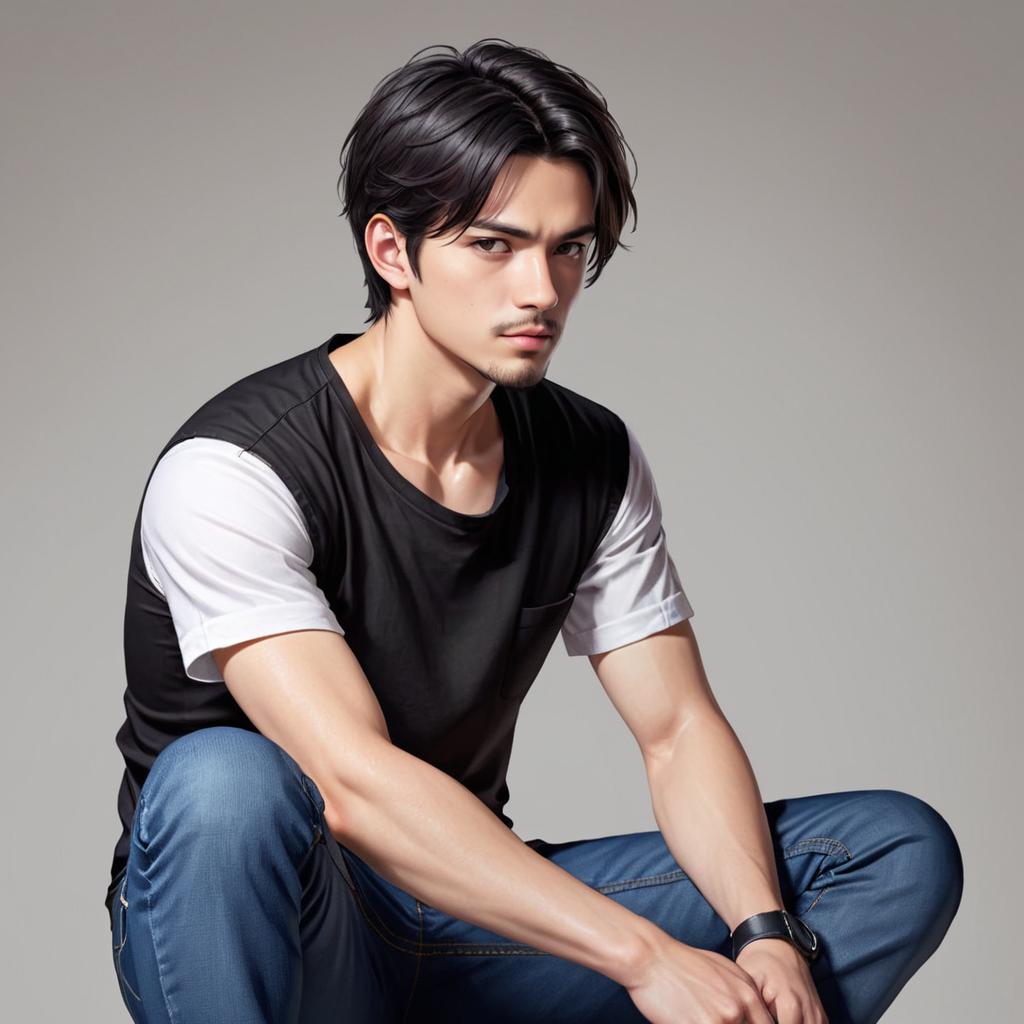 1boy, male focus, solo, shirt, sitting, white shirt, pants, looking to the side, black hair, facial hair, short hair, t-shirt, short sleeves, black pants, realistic, own hands together, black eyes, closed mouth, brown hair, denim, jeans, parted lips