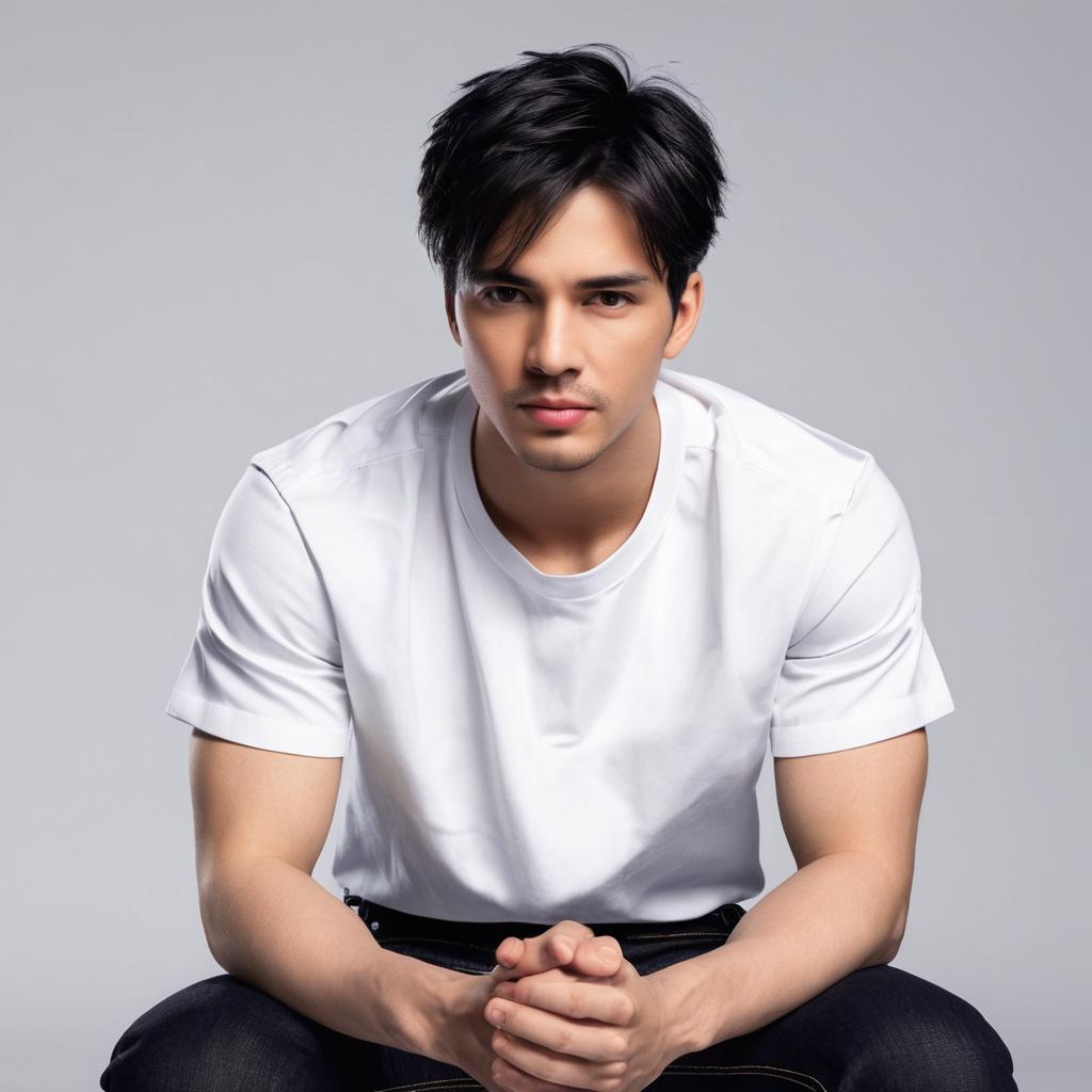 Portrait of a young Asian man with black hair, wearing a black and white t-shirt featuring a high-contrast face graphic. He is seated with a neutral expression against a plain gray background, dressed in dark jeans, posing casually with his hand resting on his knee.