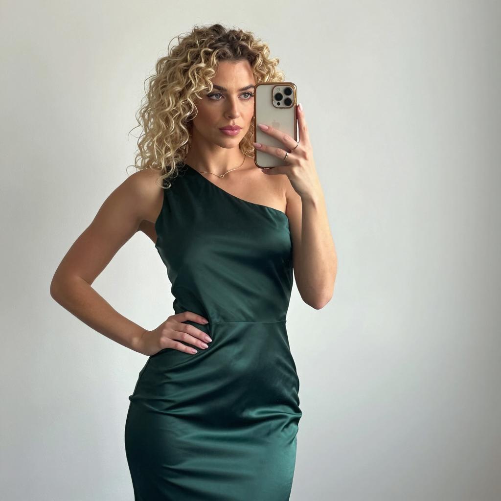 Photograph of a slim woman with curly blonde hair, wearing a green satin one-shoulder dress, holding an iPhone in her right hand, taking a selfie. She has a serious expression, wearing a gold necklace and ring. She stands against a plain white wall, her left hand on her hip. The iPhone case is gold.