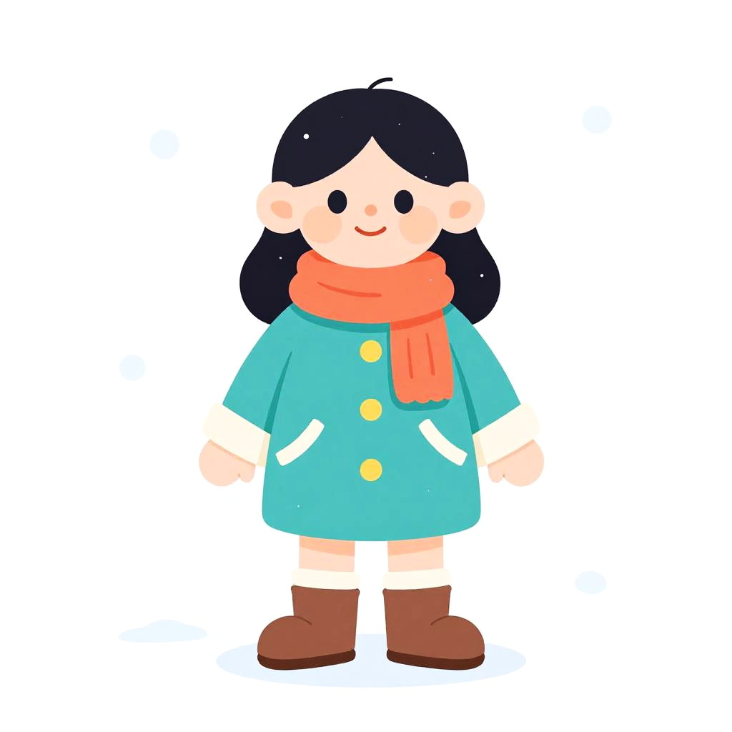 Illustration character design, cartoonish whimsical style. Girl in snow, bright colors, simple geometric shapes, white backdrop