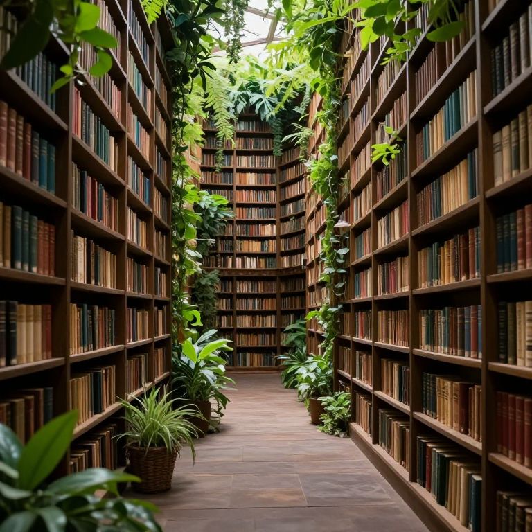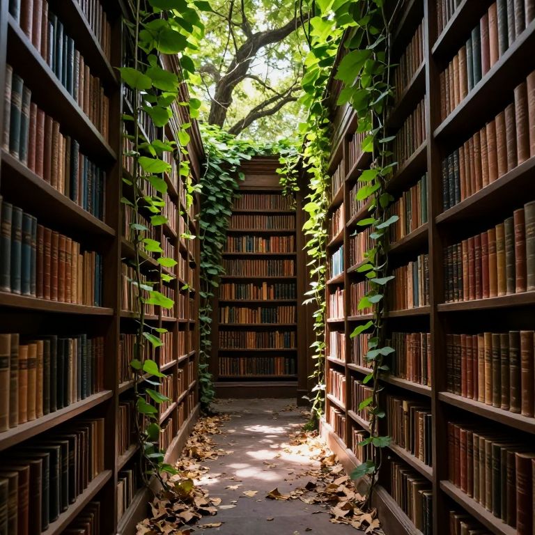 A serene path winds through an enchanted library where towering shelves of ancient books merge seamlessly with lush greenery, creating a surreal fusion of knowledge and nature.