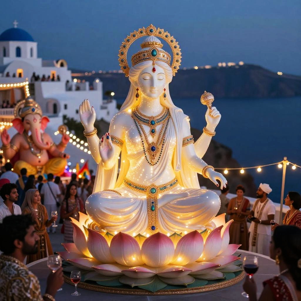 A surreal, dreamlike festival flickering where a bustling Santorini village festival at night forms the background. A elegant and glowing Greek muse, seated on a lotus throne, resplendent with a grand, cropped crown and opulent royal jewelry, cascading down. A vibrant 3D scene of a Lord Ganesha festival celebration with string lights, musicians, wine cups, creating a colorful explosion, 8k artistic photography, photorealistic concept art, soft natural volumetric cinematic perfect light, cinematic, hyper realism, high detail, octane render