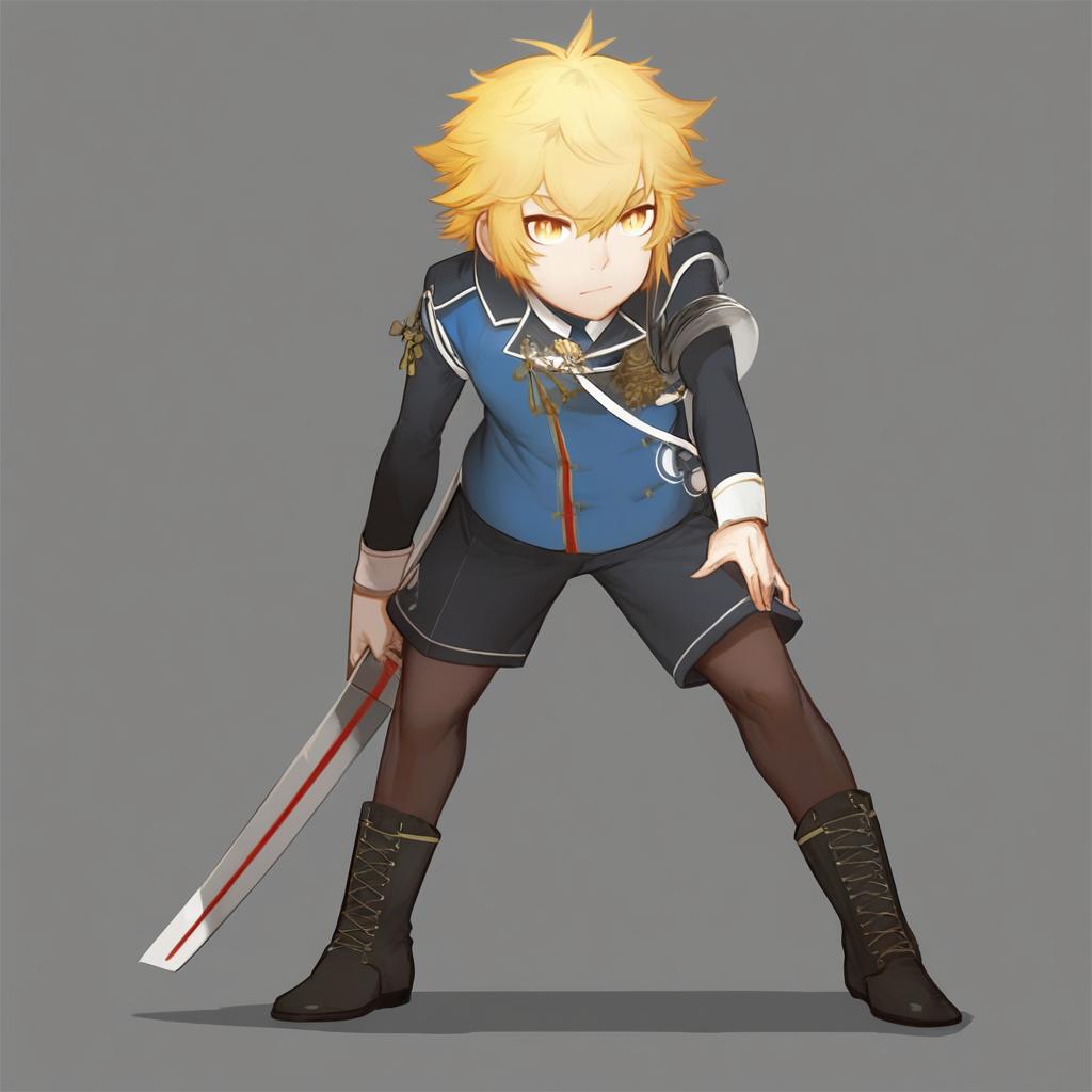 Monoyoshi sadamune, touken ranbu, 1boy, yellow eyes, blonde hair, pantyhose under shorts, lace-up boots, by artist gomtang, leet