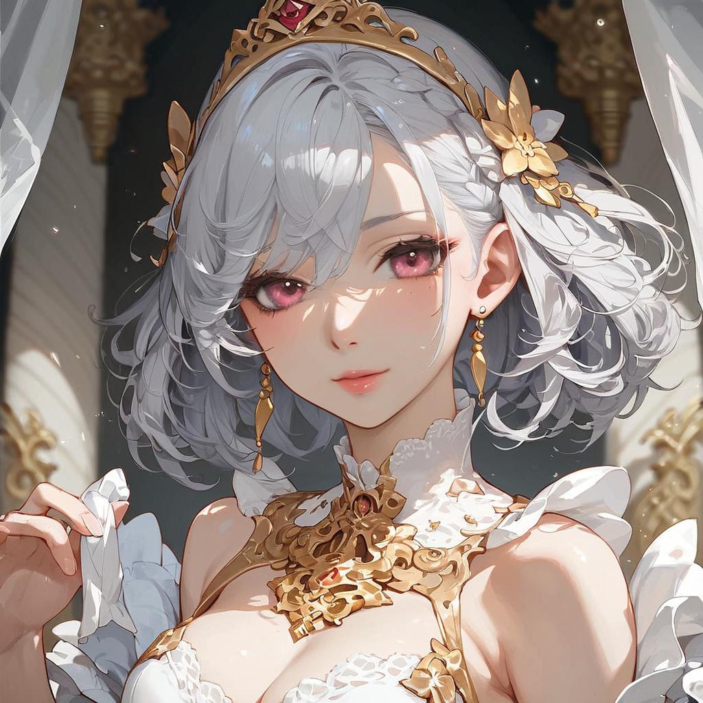 Score_9, score_8_up, score_7_up, score_6_up, score_5_up, score_4_up, source_anime, rating_safe, detailed photo of dollp, detailed hair, smooth hair, plastic skin, detailed face, 1girl, silver hair, frills classic long dress, gold accessories, looking at you, official art