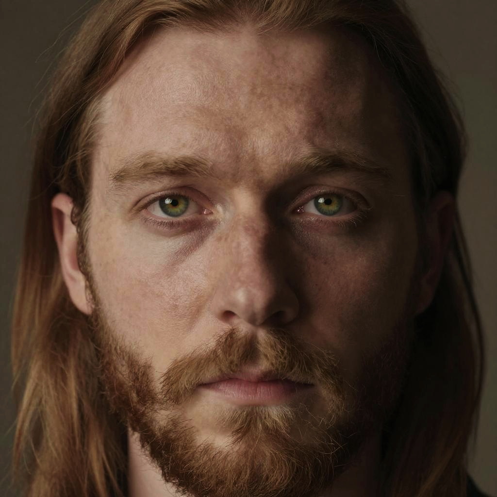 A man sporting a modern Viking haircut exudes a rugged charm against a quaint village backdrop, captured on warm-toned 3M Ferrania analog film stock for an artistic aesthetic.