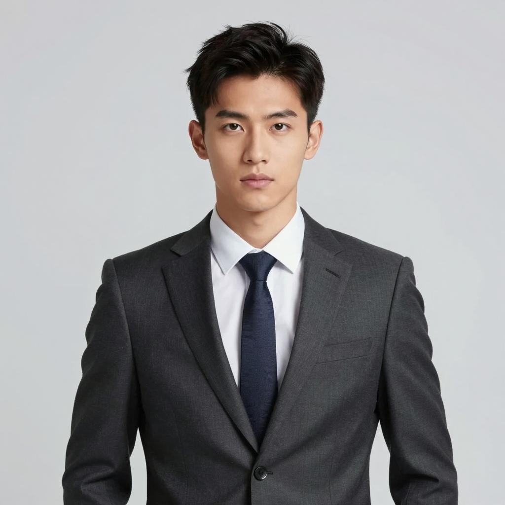 A stylish man dressed in a sleek, shiny suit poses confidently against an urban backdrop adorned with autumn foliage. The scene blends realism with artistic flair, showcasing a modern city vibe that complements his fashionable look.