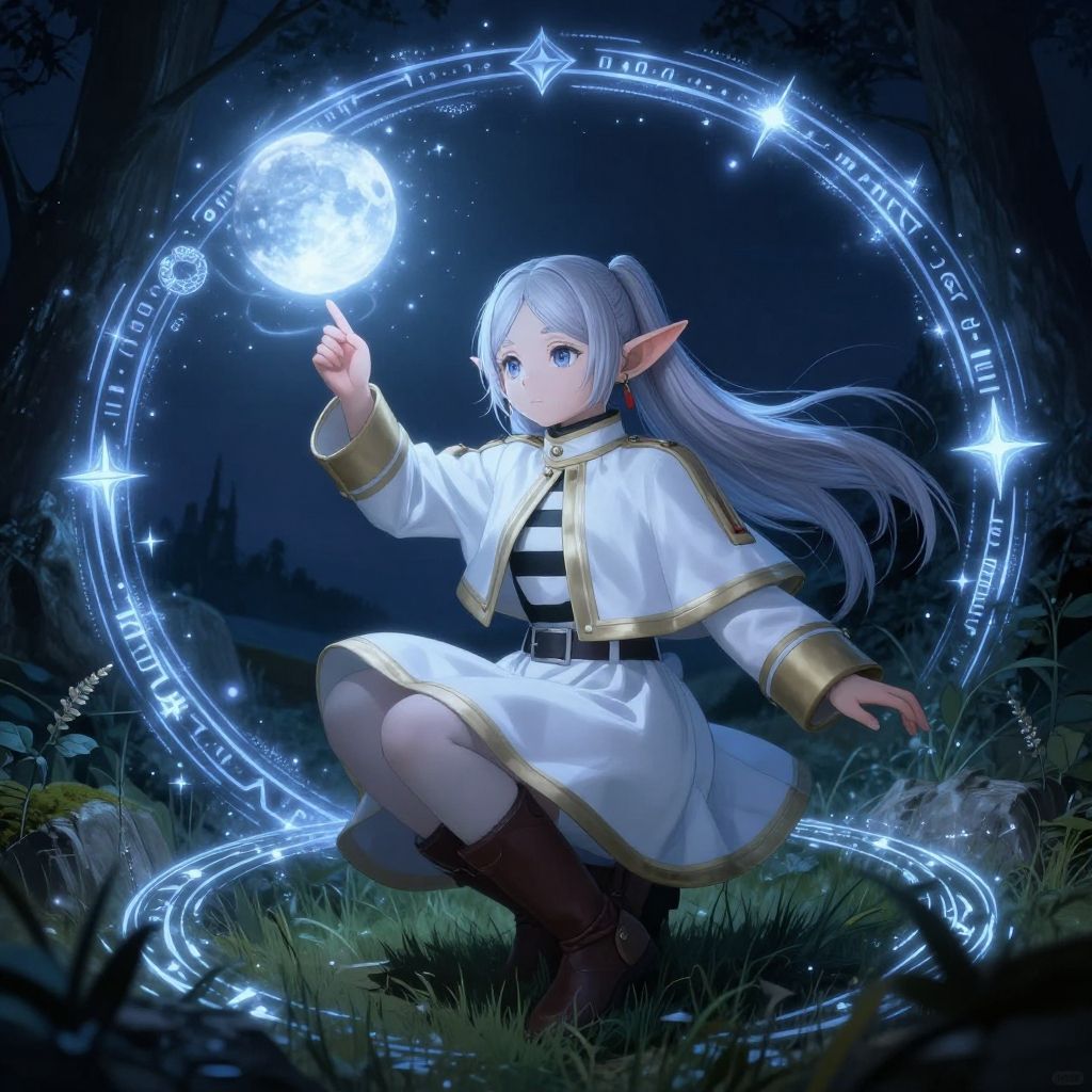 Frieren elves with silver hair and elongated ears, casting powerful spells in a moonlit glade surrounded by glowing runes, high fantasy scene, detailed fantasy illustration