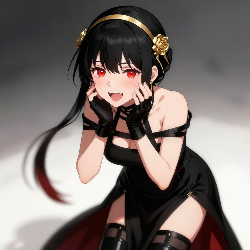 1girl, yor briar, ibarahime, (slanted eyes), :/ updo (folded ponytail hair pulled back), (Folded tied hair), (bare_shoulders off shoulder black slit dress, black fingerless_gloves, gold hairband with hair flower, gold rose ornament, black thighhighs, high heel boots, collarbone, cleavage), black hair sideburns, (slanted eyes) red eyes, medium breasts, shiny hair, bangs, gold earrings, long locks, hair between eyes, skindentation smile :>, reaching out, smile, large open mouth, fang, upper teeth, spread hands own cheeks, portrait, looking afar, contrapposto, dynamic pose, cinematic lighting, extremely quality extremely detailed, illustration, cute anime face