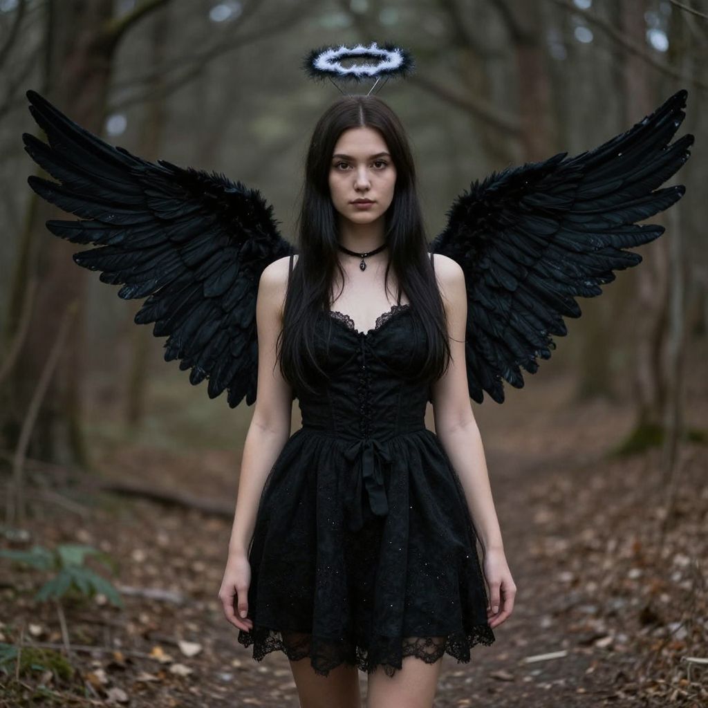 Black Angel Costume Girl, angel with black wings and halo standing in the woods