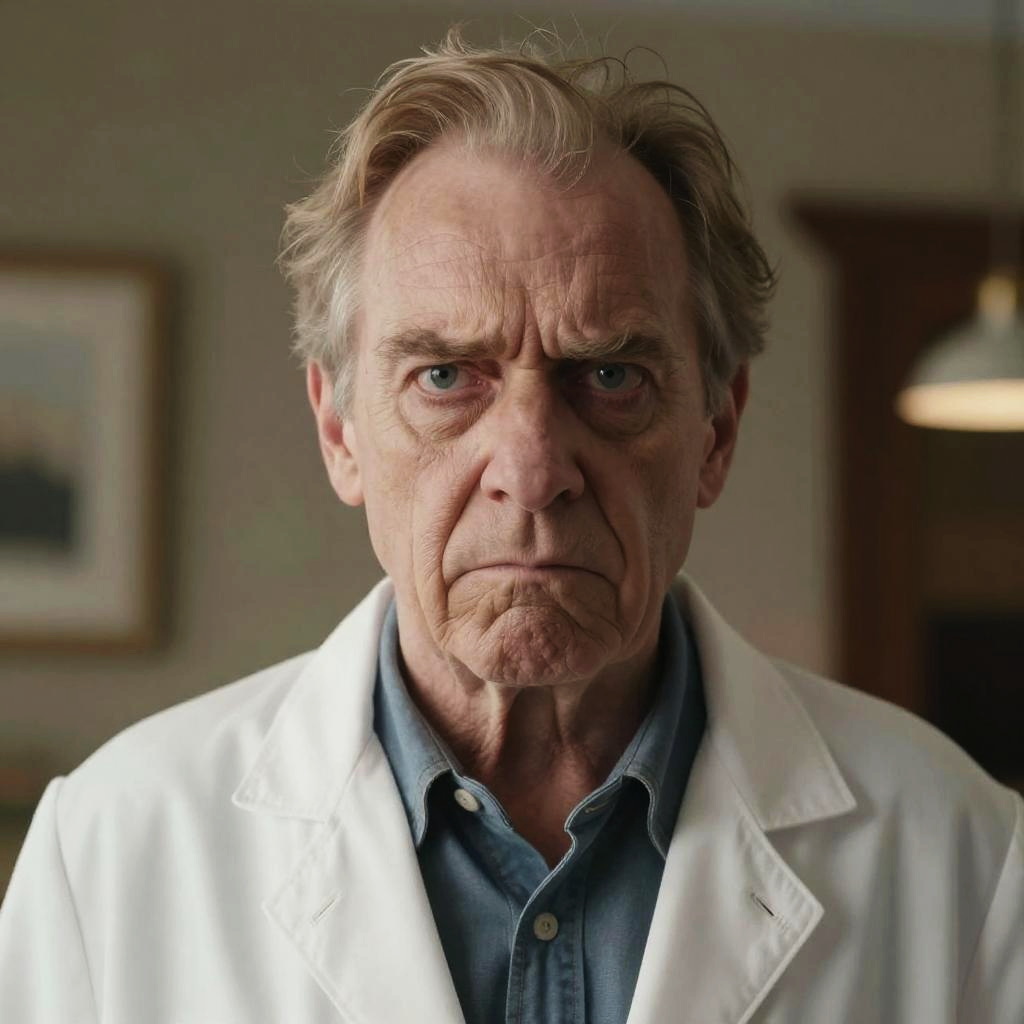 Photograph of an elderly Caucasian man with thinning, gray hair, and deep-set blue eyes. He has a stern expression with furrowed brows and slightly downturned lips. He wears a white lab coat over a blue button-up shirt. The background is blurred but shows a framed picture on the left and a dark wooden door on the right, with a hanging light fixture above. The lighting is soft, highlighting his weathered face and intense gaze. The image has a realistic, dramatic style.