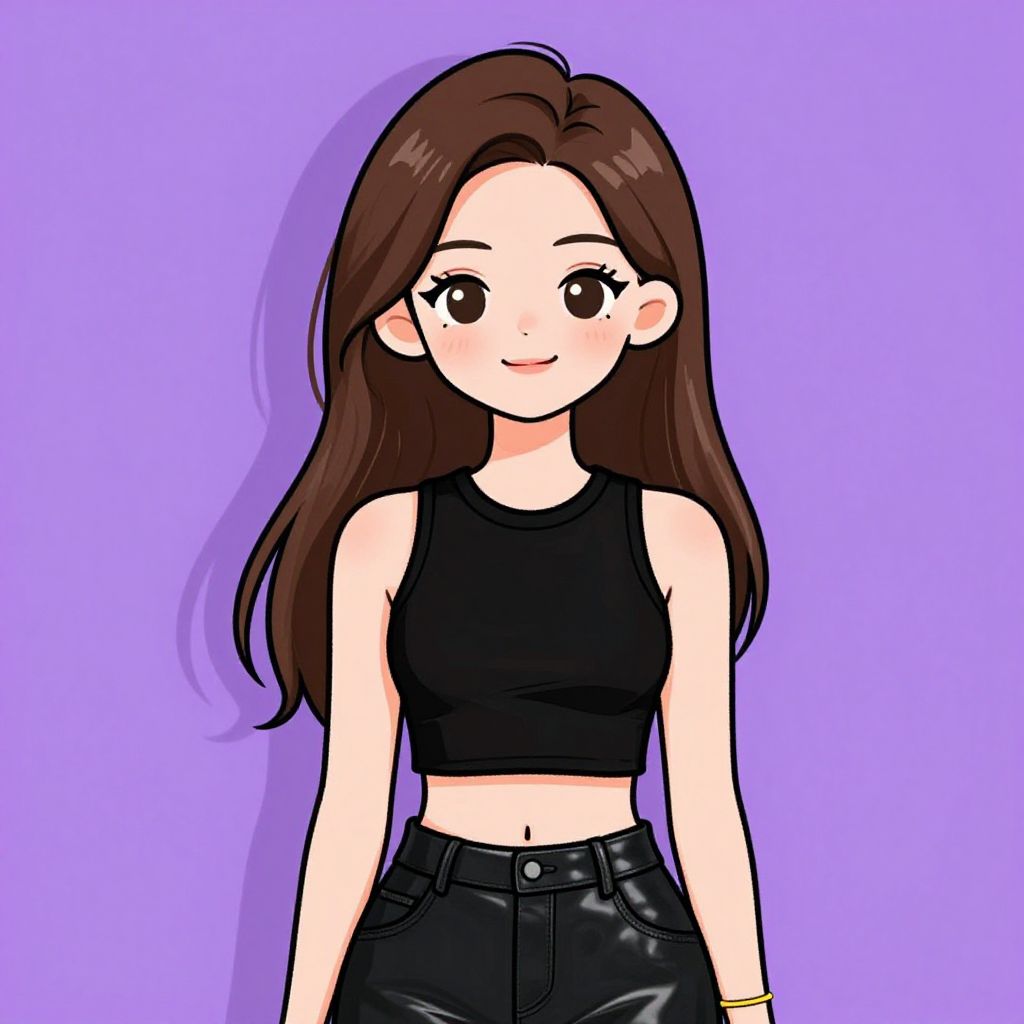 Digital drawing of a cute, young woman with long brown hair and fair skin, standing against a solid purple background. She's wearing a sleeveless black crop top and black leather pants. She has a subtle smile, brown eyes, and a small gold bracelet on her left wrist. The art style is anime-inspired with bold lines and bright colors.