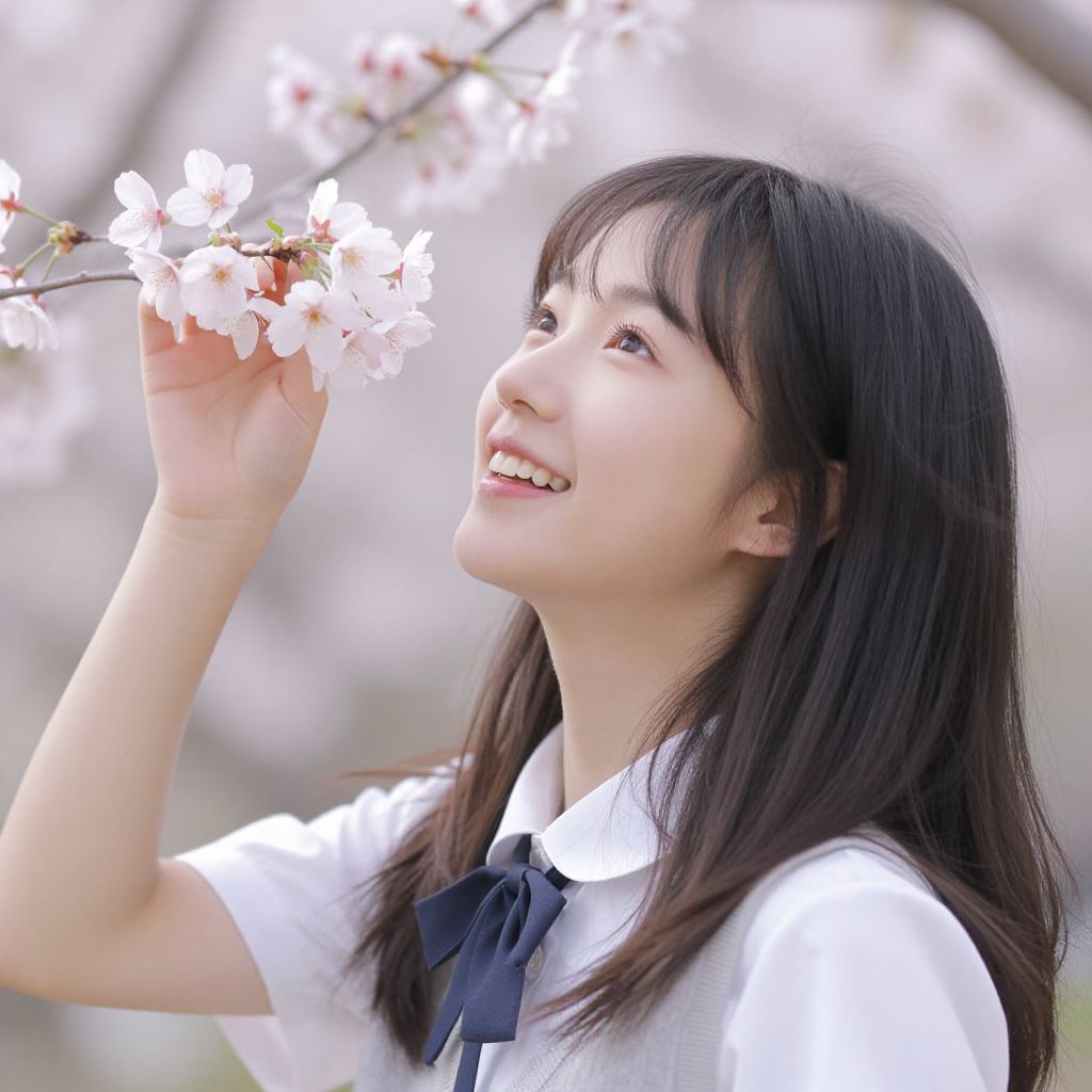 Radiant serenity blooms in the gentle embrace of spring, as a young woman's laughter intertwines with the soft whispers of blossoms, embodying the ephemeral beauty of youth and the timeless promise of renewal.
