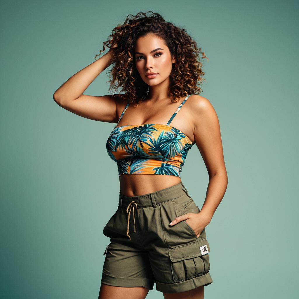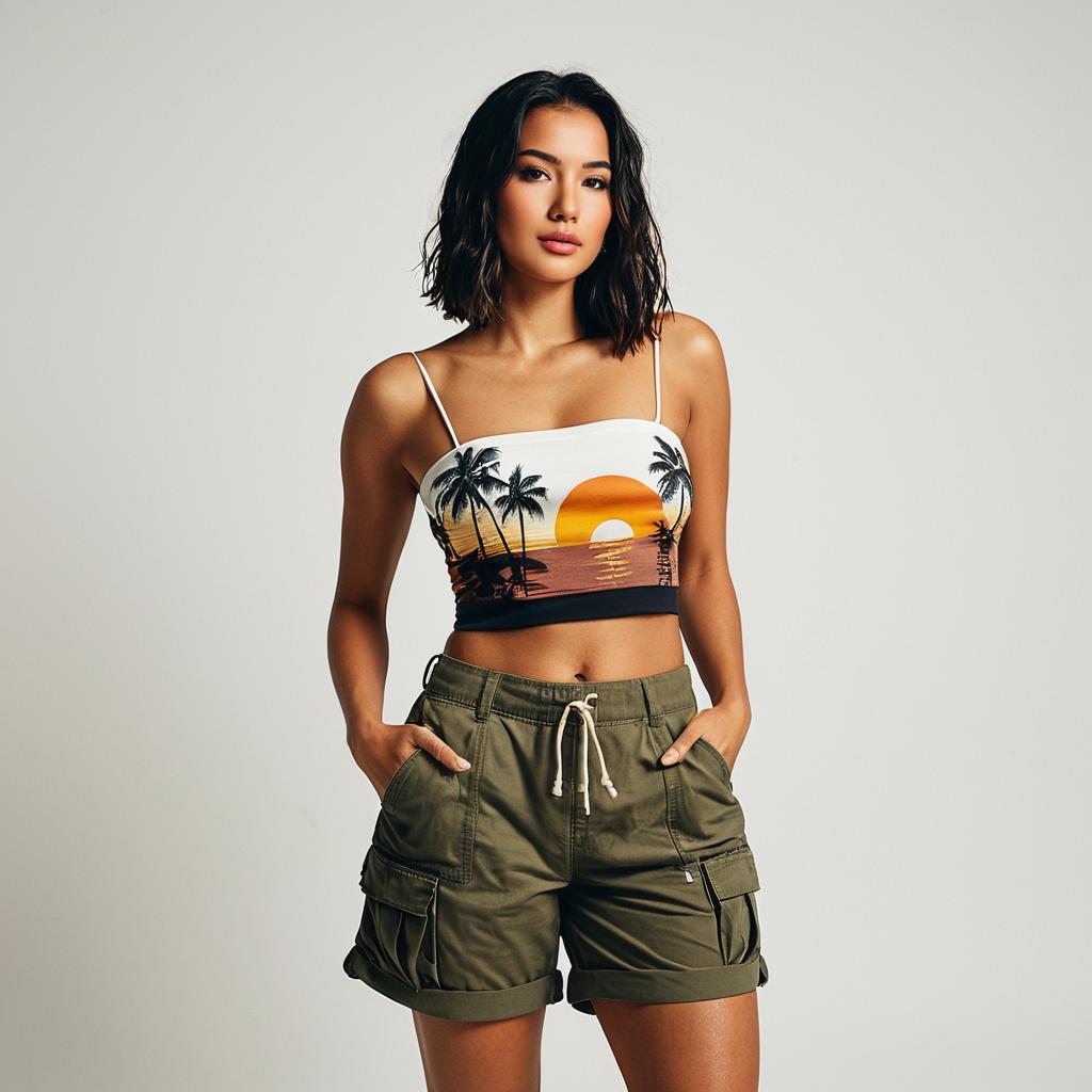 Woman wearing tropical sunset digital print tube top on dark-skinned woman with short coily hair styled with low-rise brown asymmetrical shorts with oversized utility pocket, standing with one hand on hip and slight lean forward, against tropical-themed set with blurred palm leaves, soft even studio lighting, fashion editorial photography, mid-length shot, high resolution, ultra-detailed. Big boobs, braless