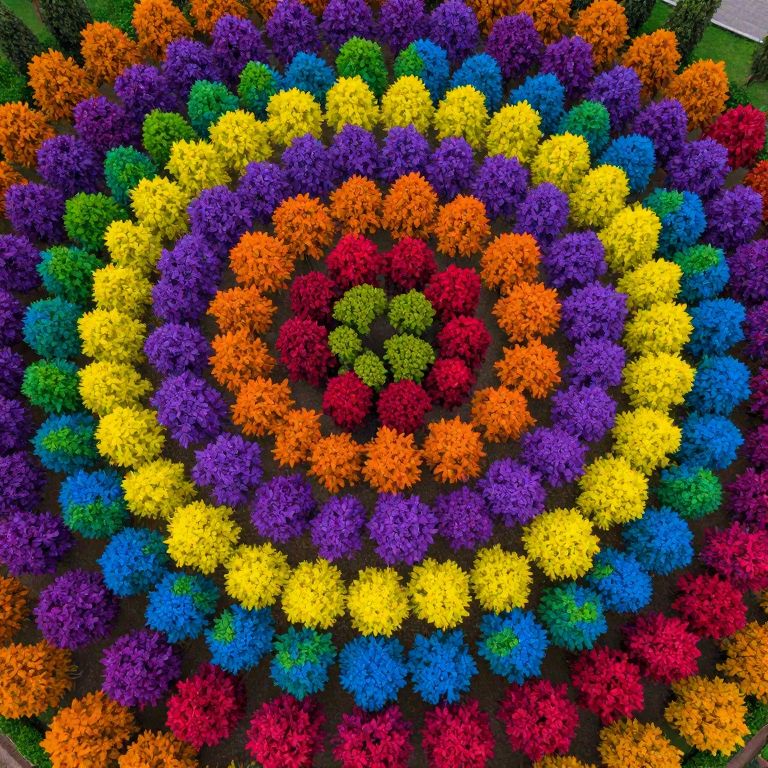 Concentric squares of vibrant, primary-colored trees bloom in layered patterns, forming a kaleidoscopic garden with distinct hues of purple, blue, green, yellow, orange, and red, each ring encircling the next in perfect symmetry atop a flat, dark surface.