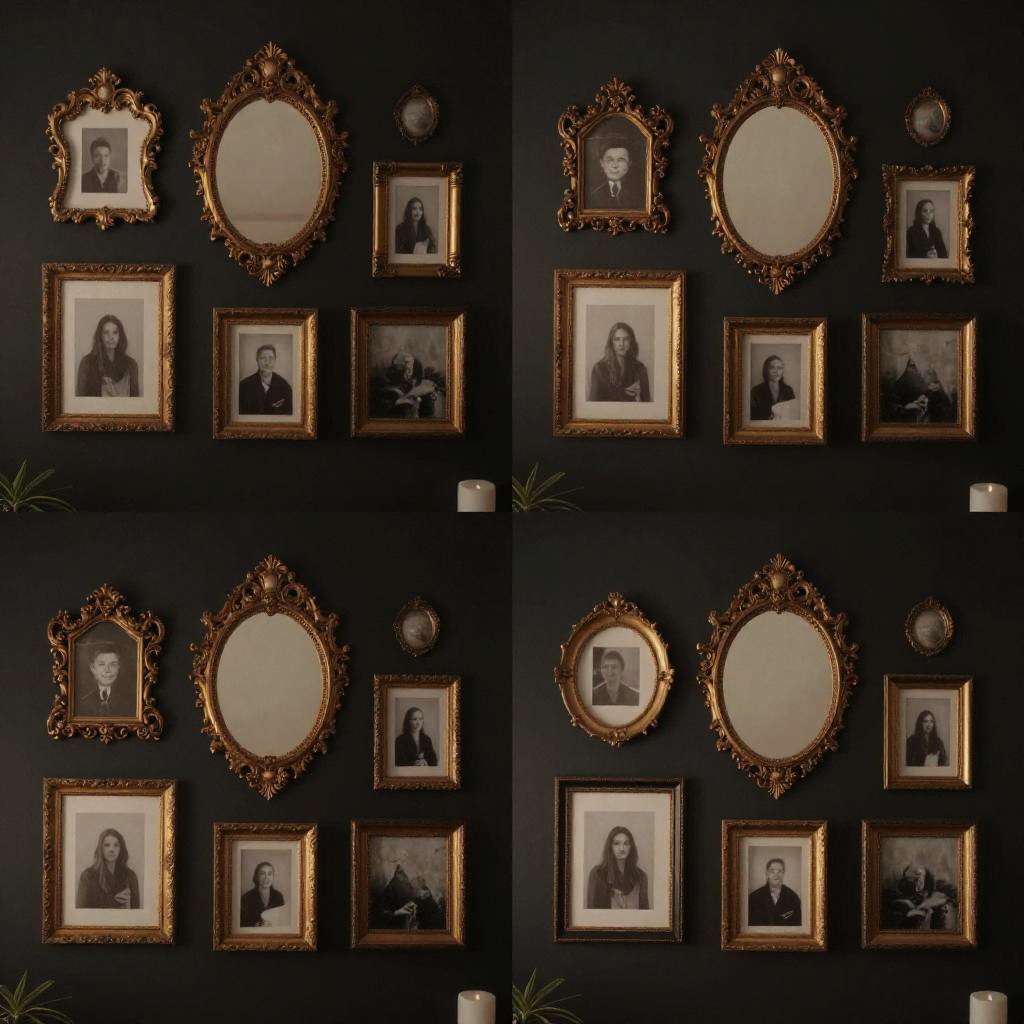 This image is a composite of four photographs showing different wall arrangements of framed pictures and mirrors. Each section has a dark, vintage feel with a mix of ornate, gold-framed mirrors and smaller, plain picture frames in various sizes. The walls are dark-colored, and the lighting varies from dim to slightly brighter. There's also a small white candle in one section and a potted plant in another.