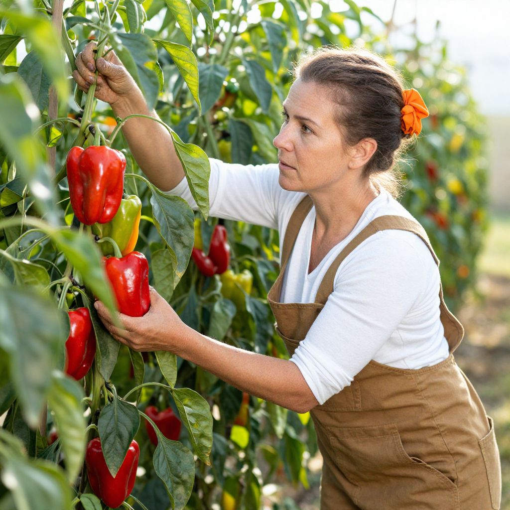 Woman harvesting vibrant red bell peppers from lush green plants in a sunlit garden, wearing a white shirt and brown overalls with an orange hair accessory.