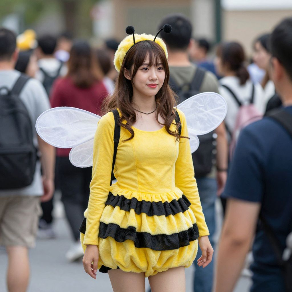 "girl bumble bee halloween, 1girl, solo, holding animal, blurry background, brown hair, antennae, hood, looking at viewer, holding, blurry, animal, bee, outdoors Realistic photo of casual sexy person with pretty face"
