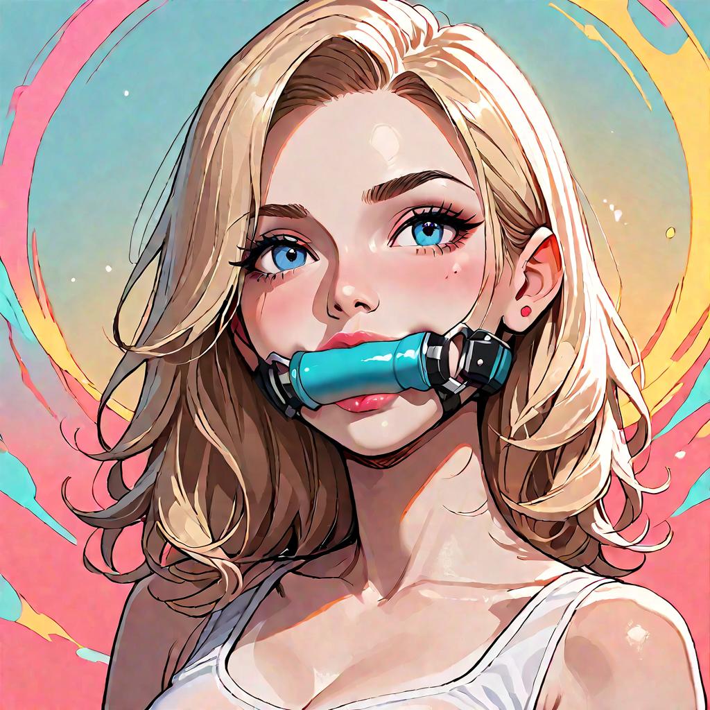 Score_9, score_8_up, score_7_up, score_6_up, score_5_up, score_4_up, (source_anime, source_cartoon, line art), 1girl, spreadergag, smooth lines, bitgag, blonde hair