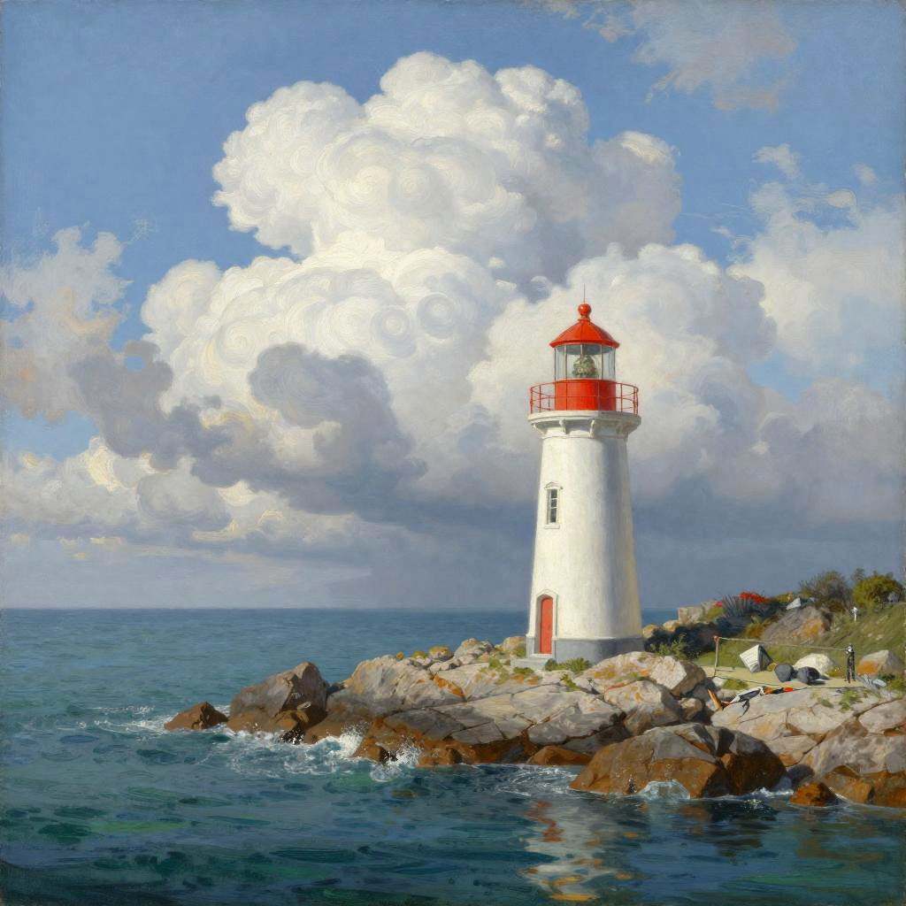 A painting by Caspar David Friedrich of a solitary lighthouse perched on rocky shores amid calm turquoise waters. Bright sunny day with dramatic white cumulonimbus clouds building in the distance, intricate and hyper-realistic