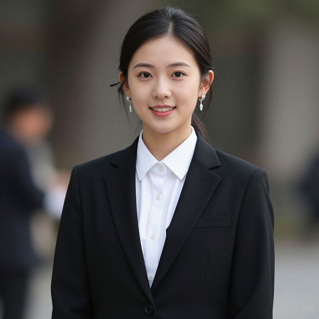 Photograph of an Asian woman with fair skin and black hair tied back in a simple style. She is wearing a black blazer over a white dress shirt, looking directly at the camera with a slight smile. She has small, silver hoop earrings. The background is blurred, featuring indistinct figures and a mix of gray and green tones, suggesting an outdoor urban setting. The woman's attire and confident expression convey professionalism and elegance. The lighting is natural, highlighting her face and outfit.