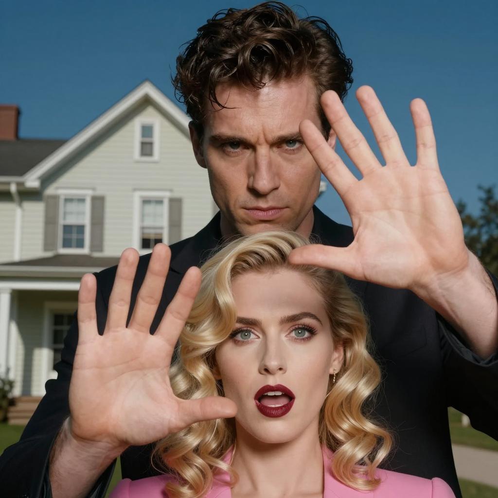 Photograph collage of a man and a woman. Man with dark hair, intense expression, hands raised, blocking face. Woman with blonde curls, dark lipstick, pink top, surprised expression. Old house in background. Blue and dark blue background.