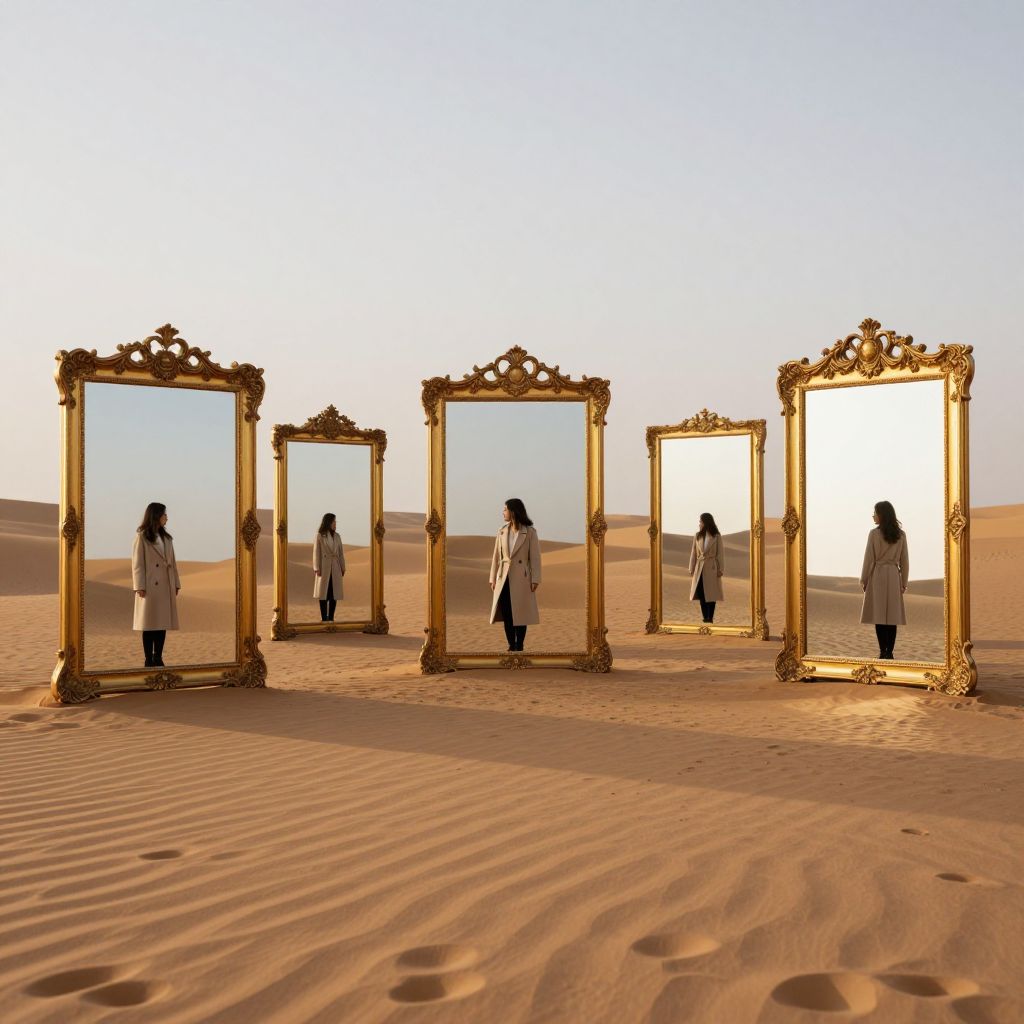 Desert landscape bathed in golden sunlight features seven large, ornate gold-framed mirrors standing upright, each reflecting a woman in a beige coat, creating an illusion of multiple realities converging in an endless expanse of sand.