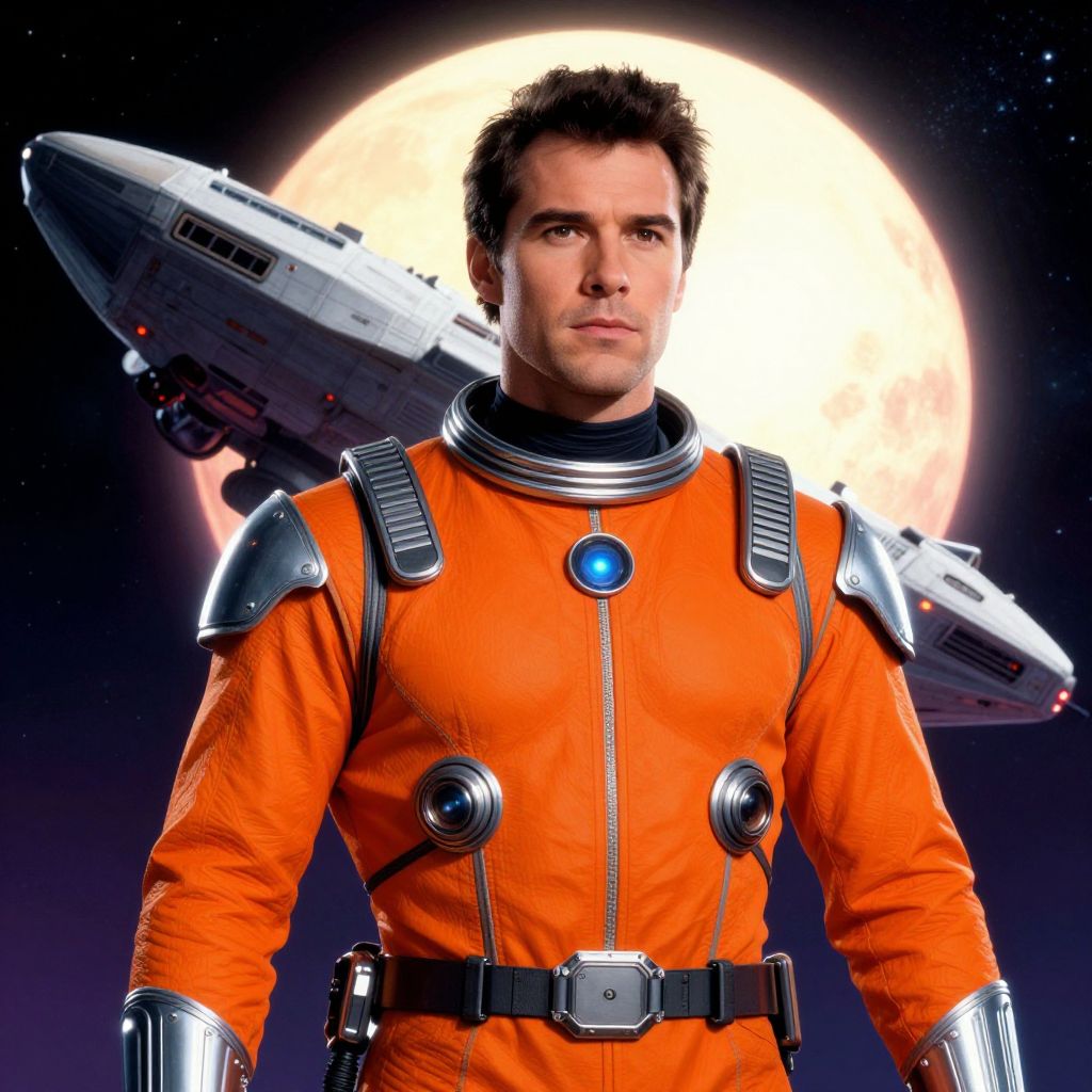 Photograph-style CGI image of a handsome white man with short, dark brown hair, wearing an orange space suit with metallic shoulder pads, a blue circular emblem on the chest, and black gloves. He has a confident expression and stands in front of a large, glowing full moon in a starry night sky. A silver spaceship is hovering behind him to the left. The suit has a sleek, futuristic design with a black utility belt. The overall aesthetic is reminiscent of classic science fiction, with vibrant colors and a dramatic space setting.