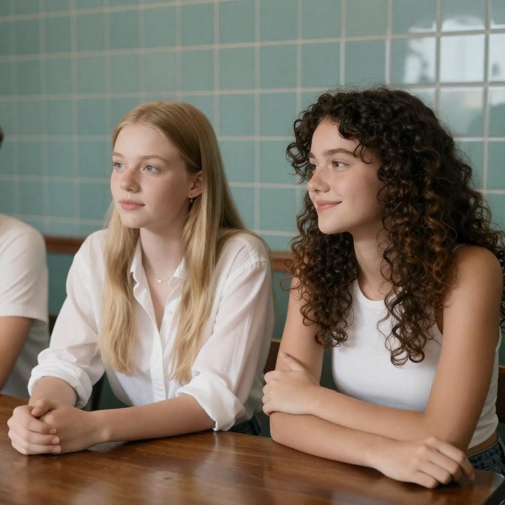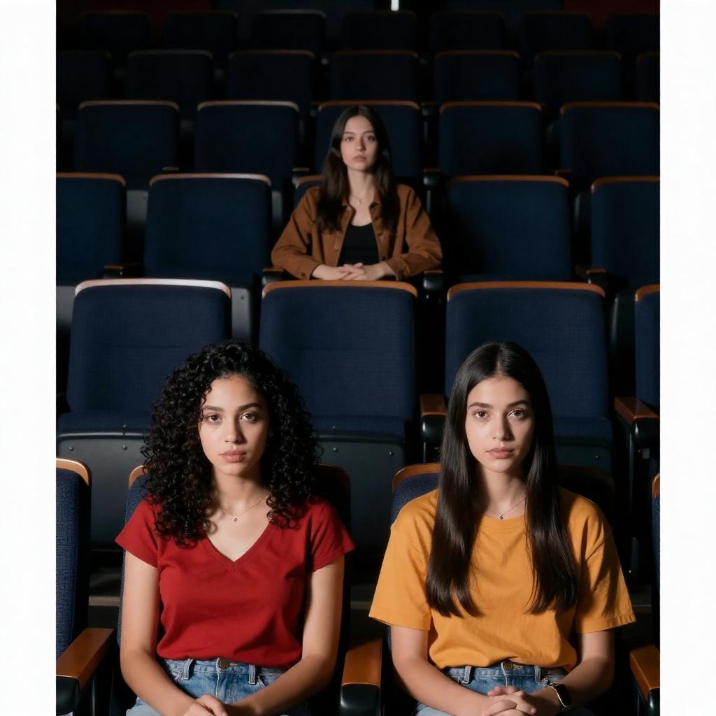 Photograph of a movie theater. A long-haired woman in a brown jacket sits alone in the upper row. In the foreground, two women with curly and straight black hair, wearing red and orange tops, sit closer to the camera. The theater seats are dark blue with wooden armrests.