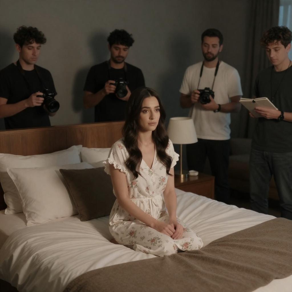 Photograph of a woman in a white floral nightgown sitting on a bed with beige sheets, brown blanket, and white pillows. Four men stand around her, two holding cameras, two with notebooks. Dark room, dim lighting, wooden headboard, lamp on nightstand. Woman's hands clasped in her lap, serious expressions.