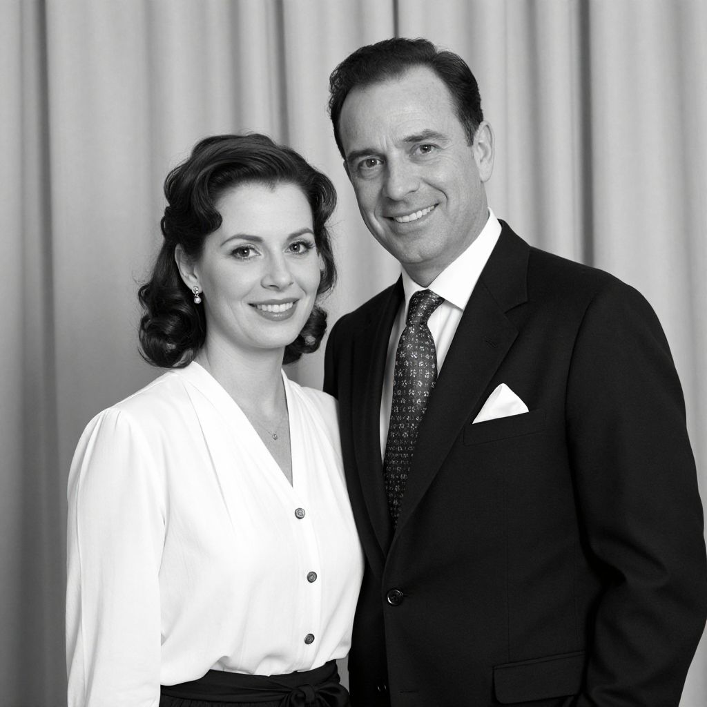 Elegantly dressed couple posing together in a classic black-and-white portrait, with the woman wearing a white blouse adorned with buttons and the man in a dark suit with a patterned tie and pocket square, both smiling warmly against a soft curtain backdrop.