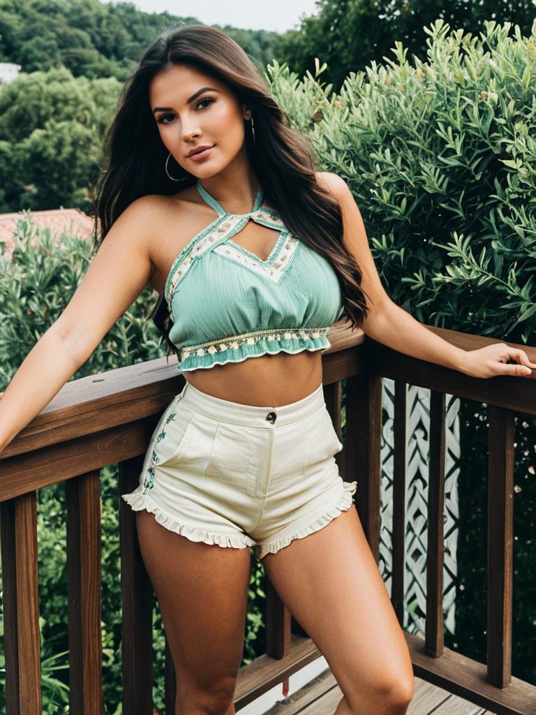 Big boobs woman wearing ruffled halter crop top with embroidered neckline and high-waisted fitted shorts in white ruffled top with bright red shorts on smiling brunette woman with long straight hair and sun-kissed skin posed cropped selfie from above emphasising ruffled neckline and shorts in tropical-feeling balcony surrounded by palm fronds, backlit sunlight with soft halo around hair and shoulders, playful summer vacation fashion photography, high resolution, ultra-detailed