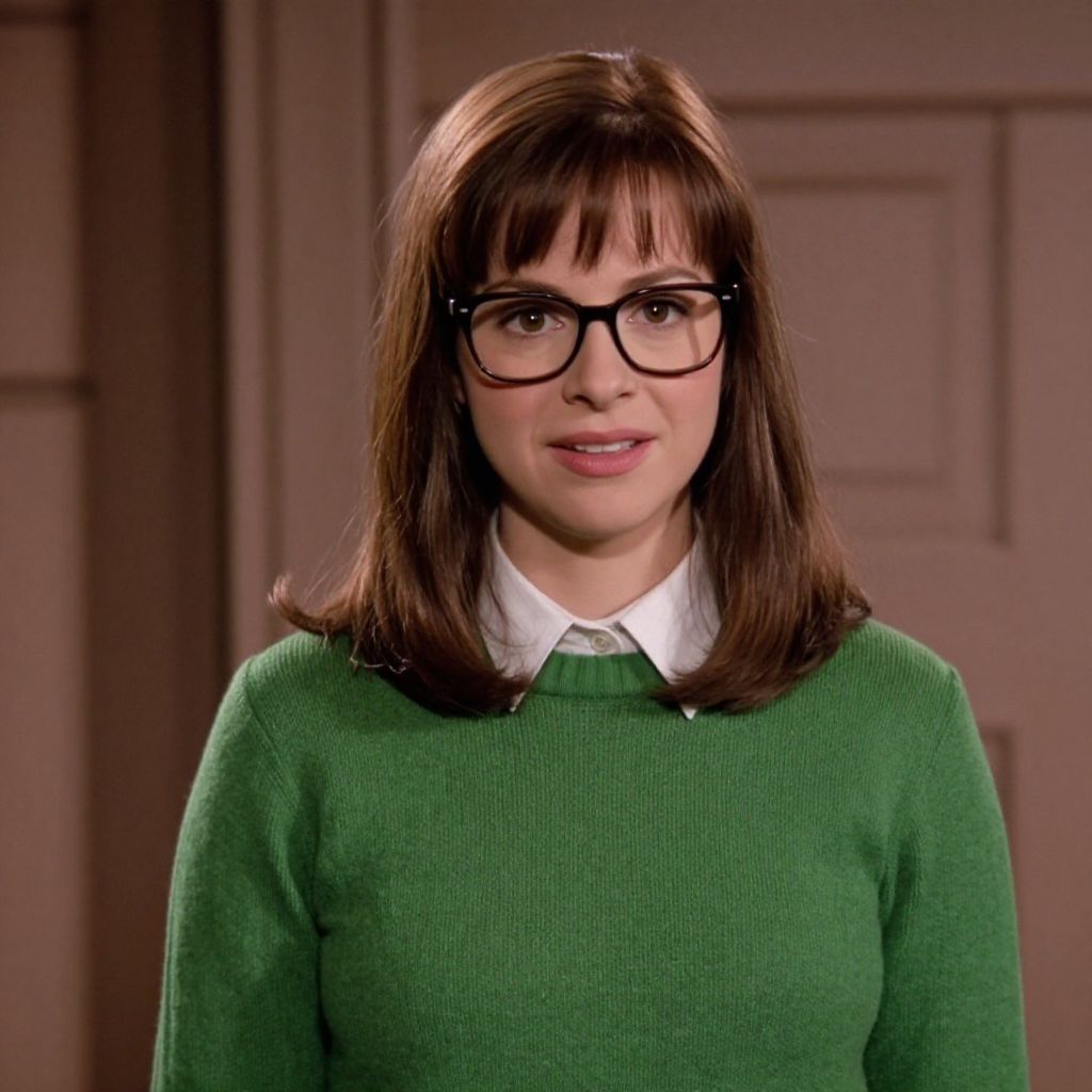 "Velma Dinkley Image, woman in glasses and a green sweater posing for a picture"