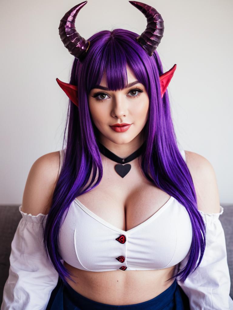 Photo-realistic cosplay photo of person in akuma nihmune costume. 1girl, demon horns, demon girl, ear piercing, red eyes, purple eyes, pink eyes, mole under eye, purple hair, long hair, very long hair, blunt bangs, hairclip, large breasts, cleavage, navel, heart tattoo, facial tattoo, white shirt, bare shoulders, virtual youtuber, virtual youtuber, heart facial marklifestyle stock photo, shallow depth of field, lifestyle stock photography, shallow depth of field, natural lighting, warm tones, soft background blur, candid moments, vibrant colors, realistic textures, modern casual clothing. full body shot