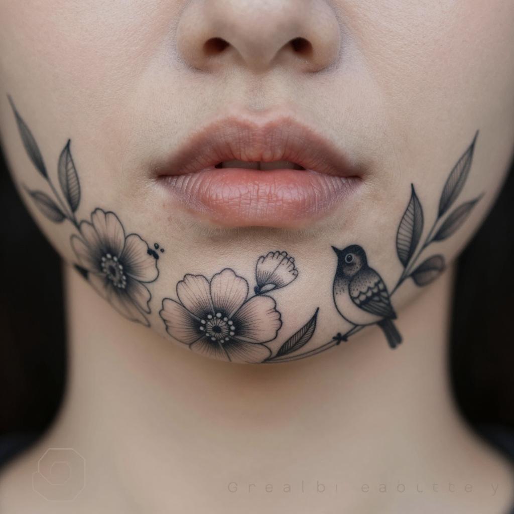 Close-up of a person's lips with intricate black floral and bird tattoo design on pale skin. Tattoo features flowers, leaves, and birds, with detailed lines and shapes. Hexagonal at bottom left. "girlgreybeauty" below .