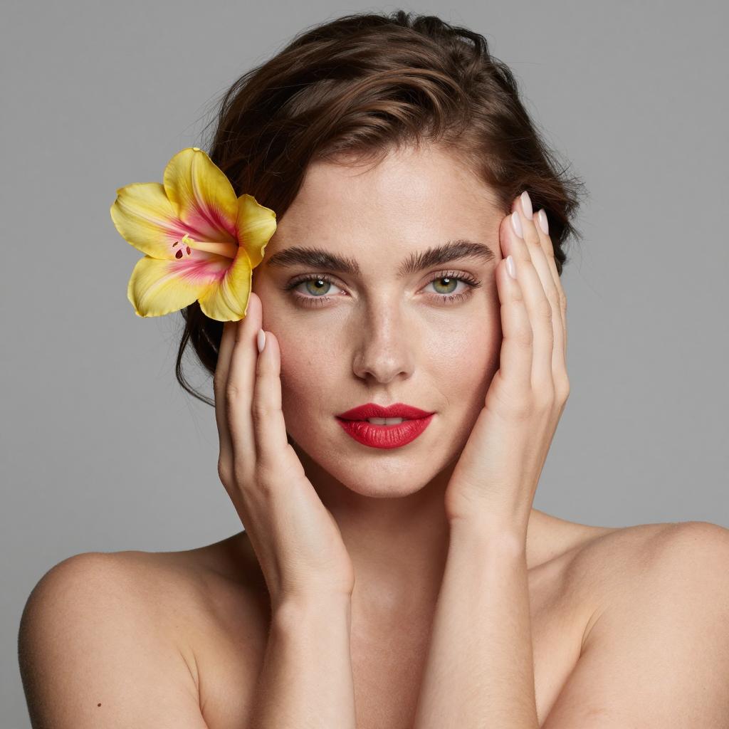 Photograph of a young woman with light skin, green eyes, and red lipstick. She wears a grey turban with a large red flower on the left side and a grey and white geometric patterned top. Her head is turned slightly to the right, looking directly at the camera. Grey background.
