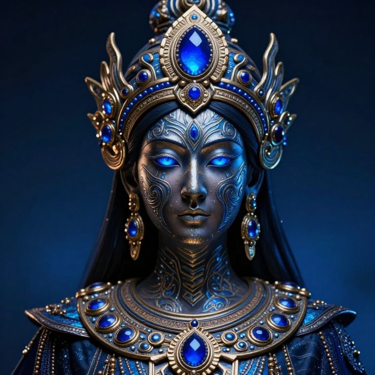 The image depicts a highly detailed and photorealistic representation of a figure adorned in elaborate, ornate attire that evokes a sense of ancient, sacred symbolism. The figure's face is adorned with intricate, metallic patterns and a series of blue, glowing eyes that exude a sense of otherworldly presence. The headpiece is a masterpiece of craftsmanship, featuring gold and blue accents, and is crowned with a central, large, blue gemstone that adds to the mystical aura. The figure's attire includes a series of circular, metallic elements that drape around the neck and shoulders, enhancing the regal and divine appearance. The background is a gradient of deep blues and blacks, creating a dramatic contrast that highlights the figure's detailed features and the shimmering textures of the attire. The overall composition is balanced, with the figure centrally positioned, drawing the viewer's attention to the intricate details of the headpiece and the glowing eyes. The lighting is soft yet intense, casting subtle shadows that accentuate the three-dimensional quality of the figure and its attire. The image is a testament to the power of digital artistry, capturing the essence of a sacred, divine figure in a visually stunning and inspiring manner.