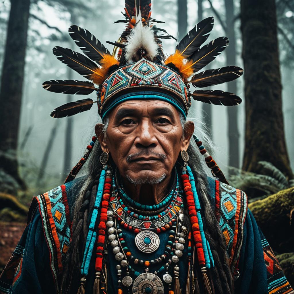 Closeup portrait of an elderly shaman wearing an elaborate headdress with feathers and a colorful tribal outfit adorned with beads and decorative medallions. The subject has traditional face paint and stands in a misty ancient forest, highlighting intricate textures and vibrant colors.