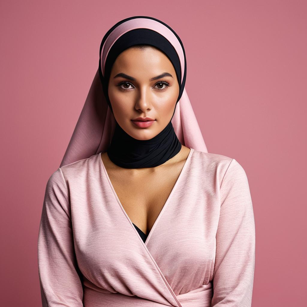 Pink mummy costume, photorealistic portrait, woman wearing pink, tight-fitting, wrapped dress and matching hood, soft pink background, neutral expression, light skin, brown eyes, straight hair covered by hood, two black circular eyeshadow marks on forehead, minimal makeup, centered composition, studio lighting, close-up, front view, soft ures, pastel colors, fashion, modern style
