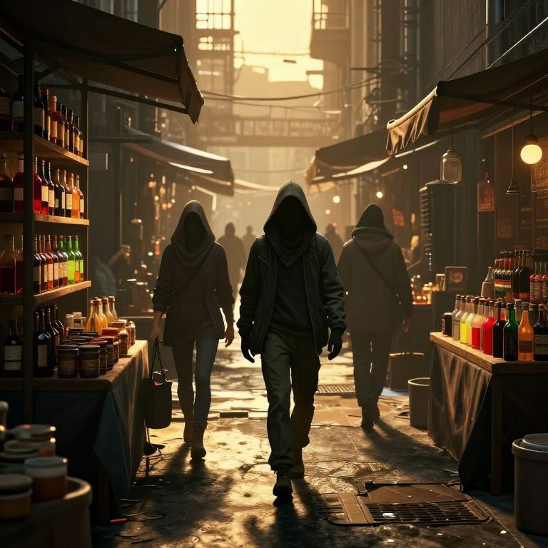 In a cyberpunk-inspired digital art rendering, cloaked figures navigate a dimly lit alleyway market bathed in golden hour light, where shelves brimming with colorful bottles and jars evoke a sense of mystery and silent trade, blending high-definition realism with atmospheric visual effects.