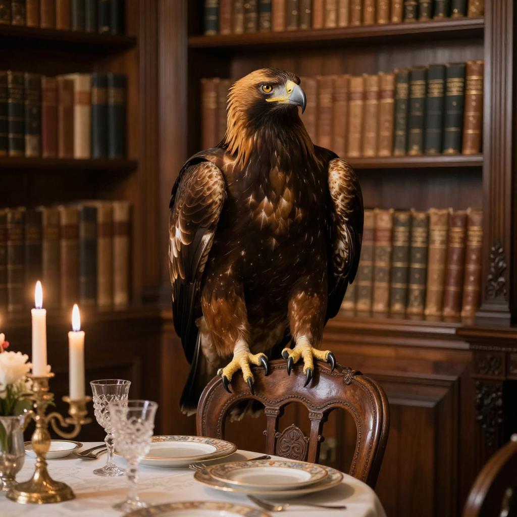 Majestic golden eagle perched on an antique wooden chair seated at a fine dining table in a ornate dark wood library filled with leather-bound books, with crystal and porcelain plateware, f/1.4 200mm zoom shallow depth of field, ultra sharp photograph, (dim candlelight glow:1.2) (masterpiece:1.2) (photorealistic:1.2) (bokeh) (best quality) (intricate) (8k) (HDR) (cinematic lighting) (sharp focus)